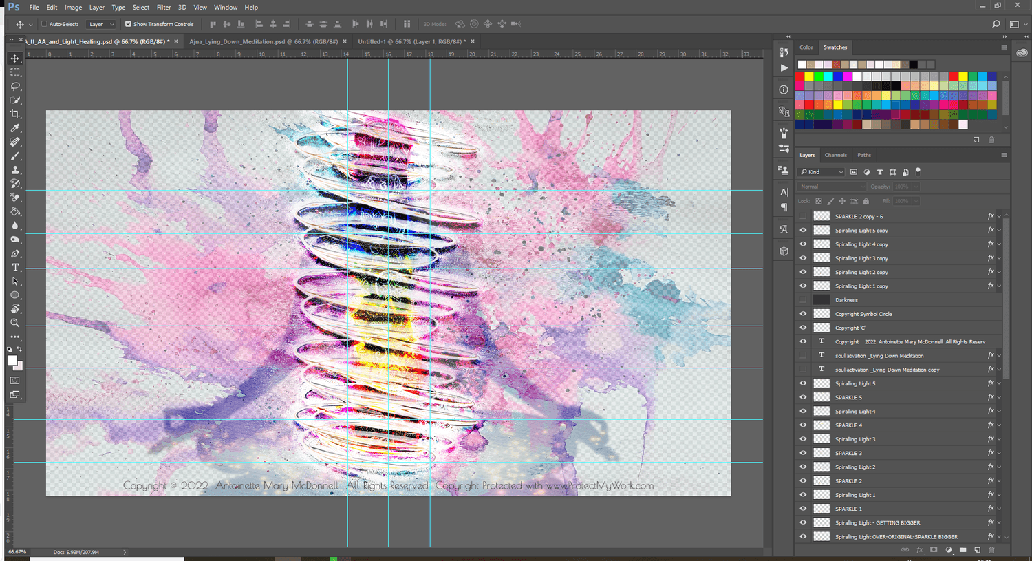 Photoshop production layers — illustrating multi-dimensional light sequencing across the chakra system. Each element was individually composited to build immersive visual depth.